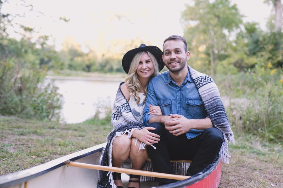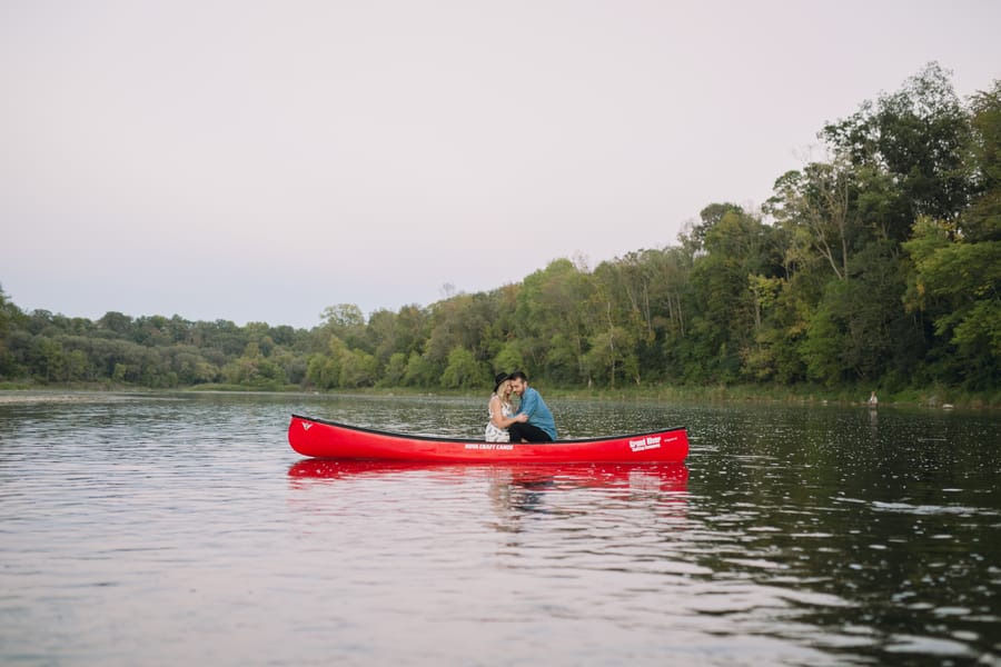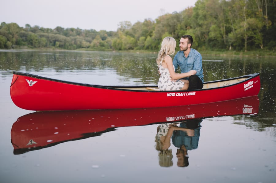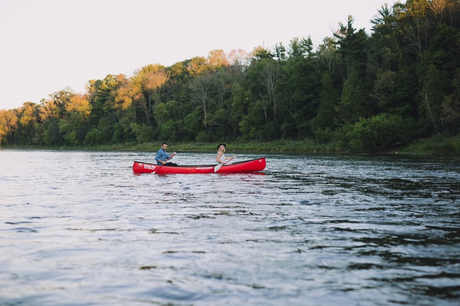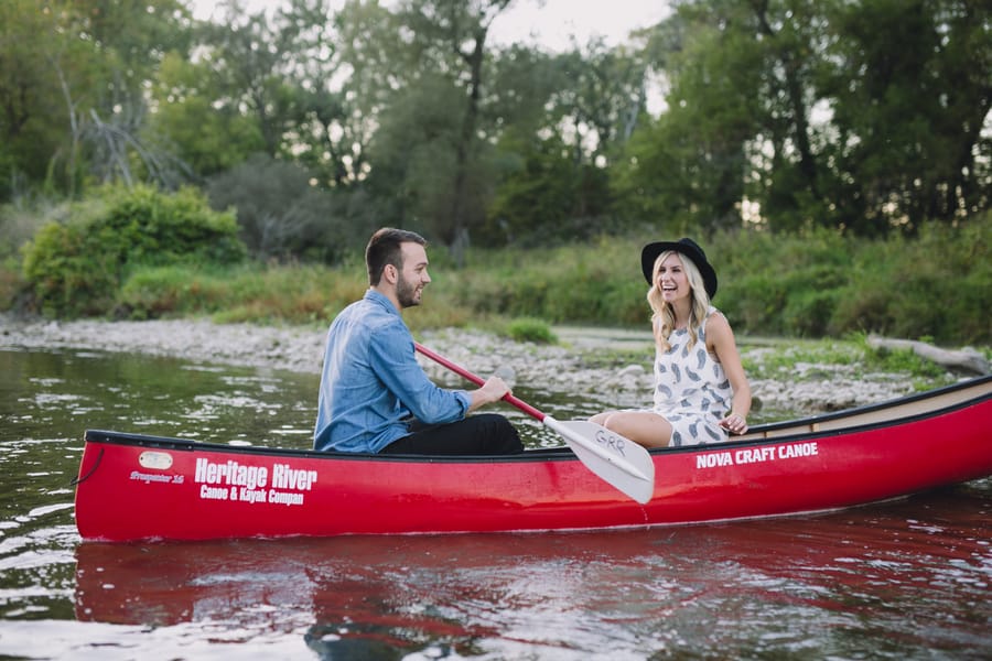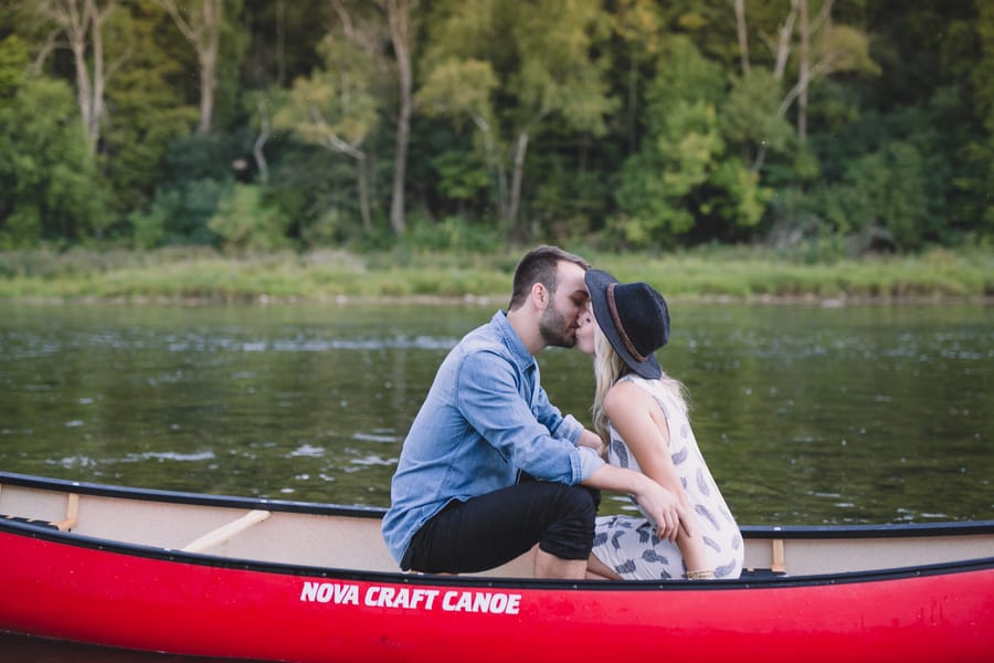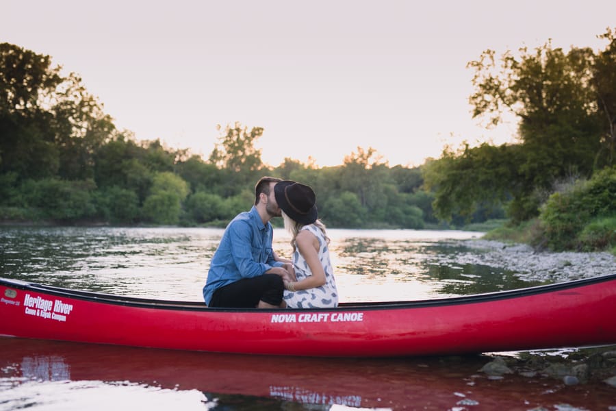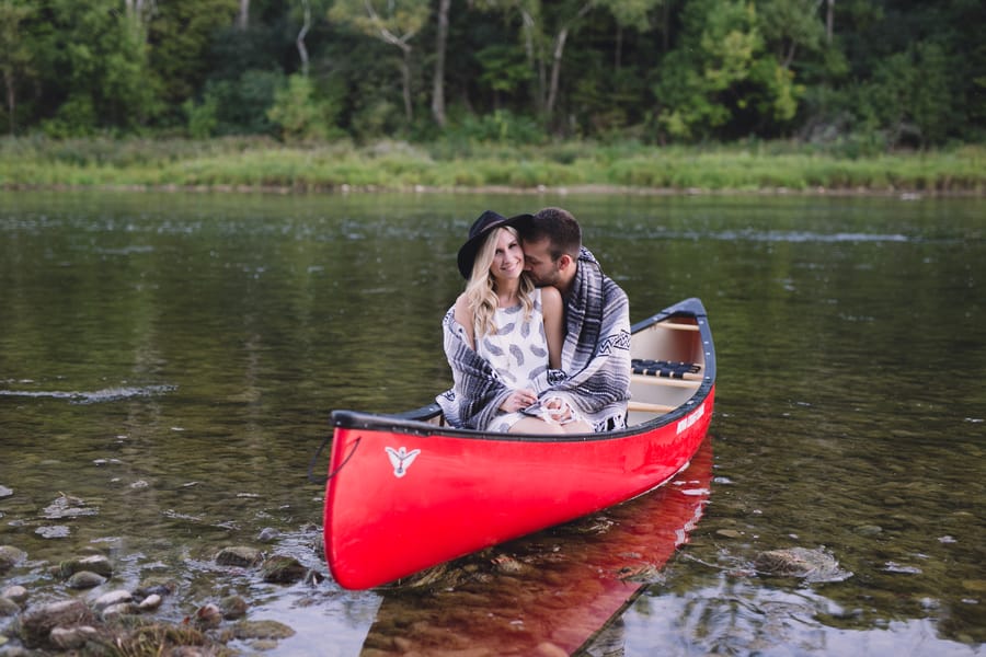 Escape into nature with **Dan and Jessica’s enchanting engagement session**, set amidst the serene beauty of an Ontario forest. Their romantic adventure featured **cozy moments around a rustic cabin**, capturing their genuine warmth, before they took to the water in a charming red canoe. This outdoor engagement shoot beautifully highlights their love story, blending the tranquility of the woods with playful paddles on the water, making for truly memorable and picturesque forest engagement photos.