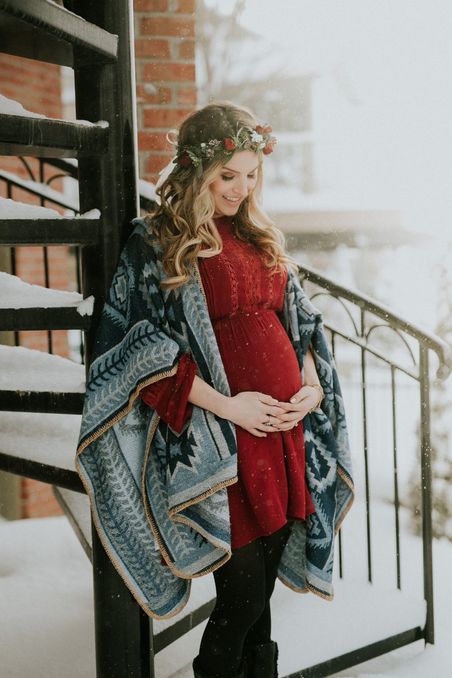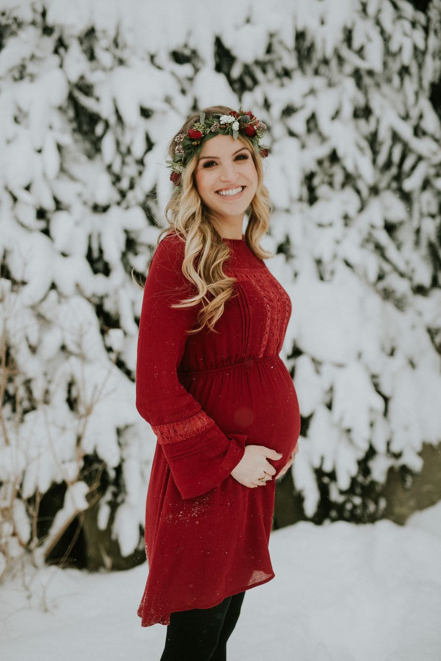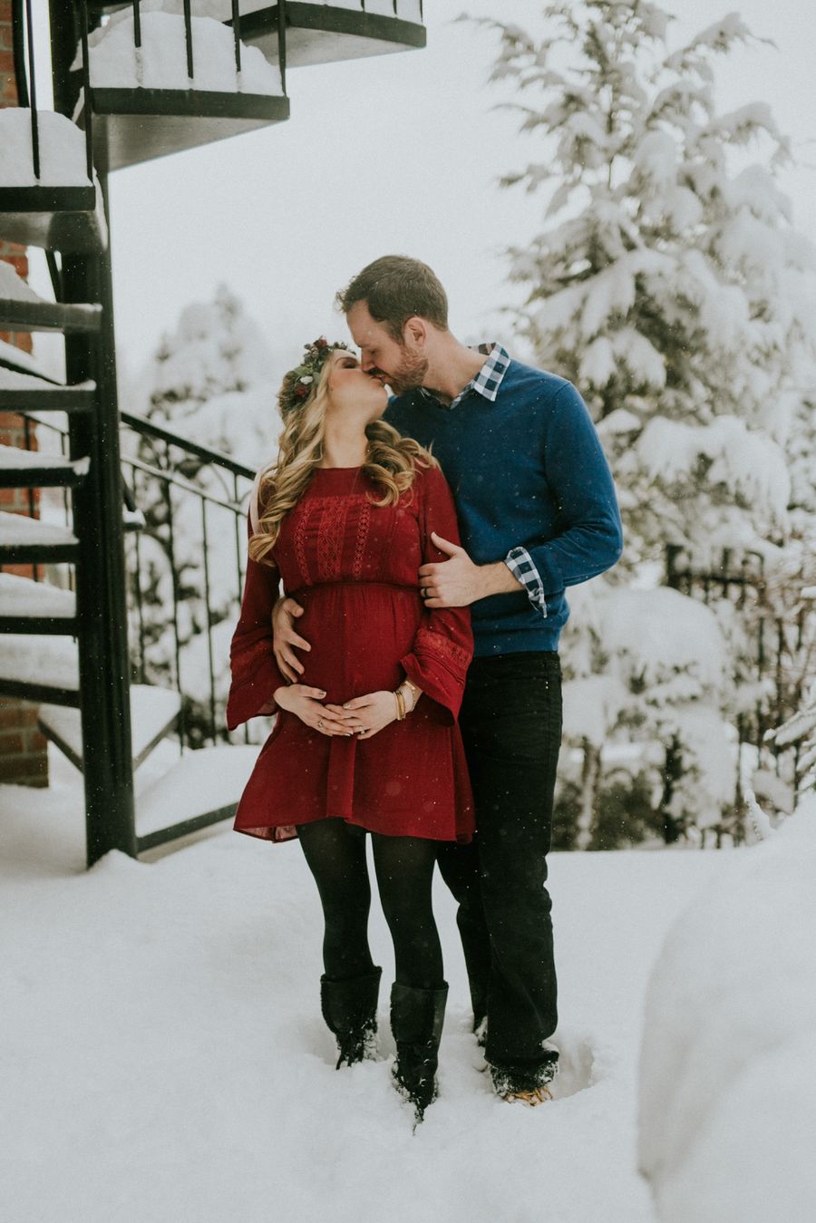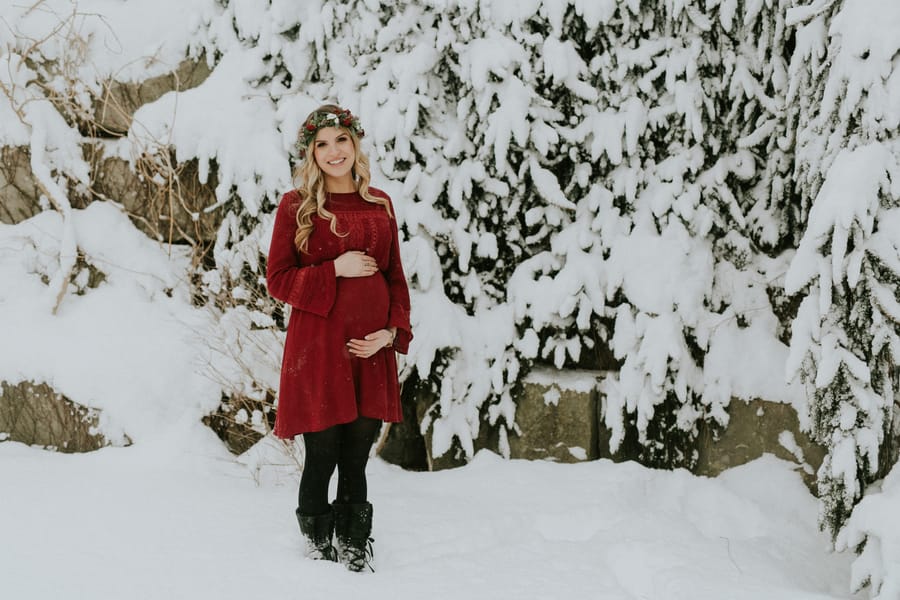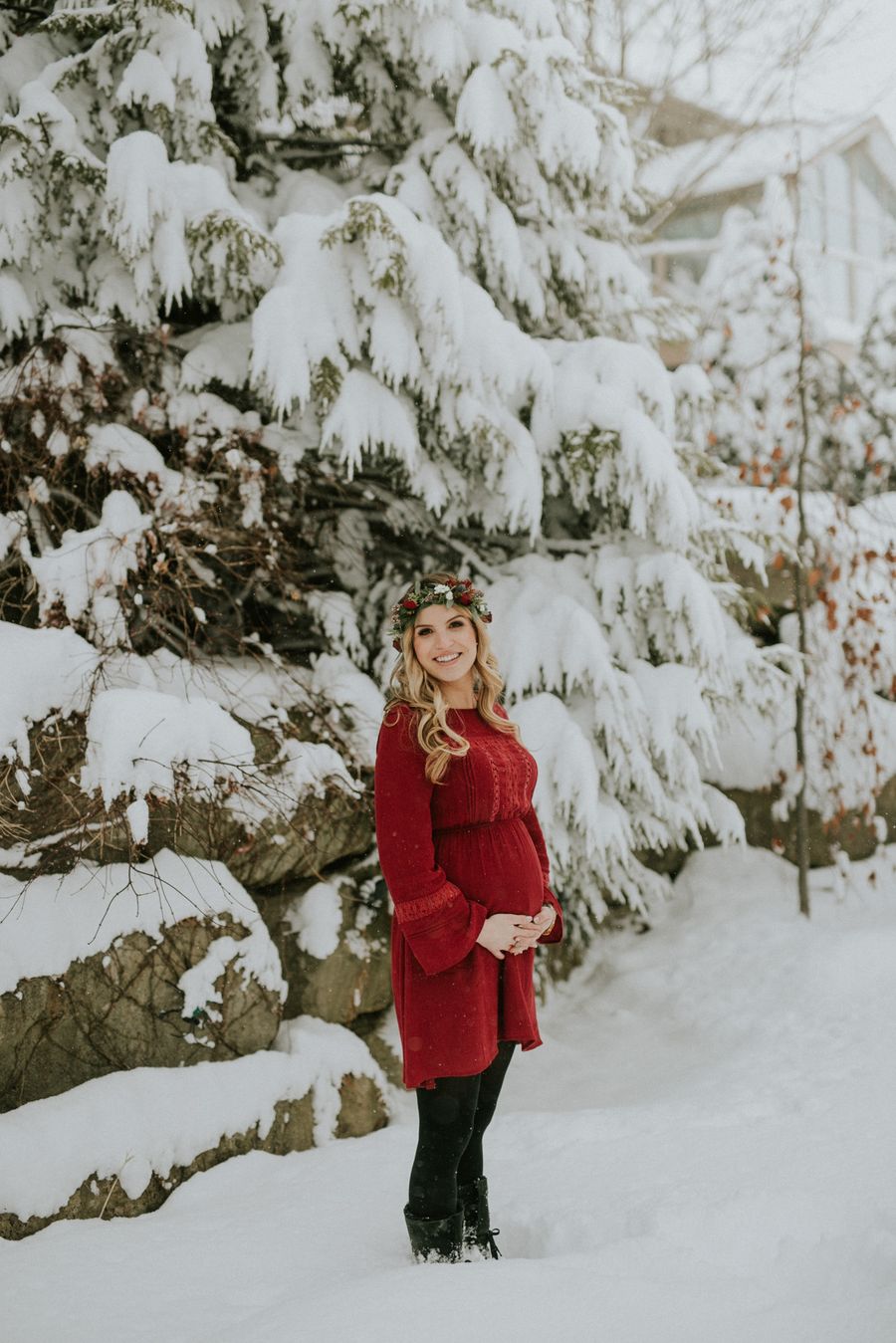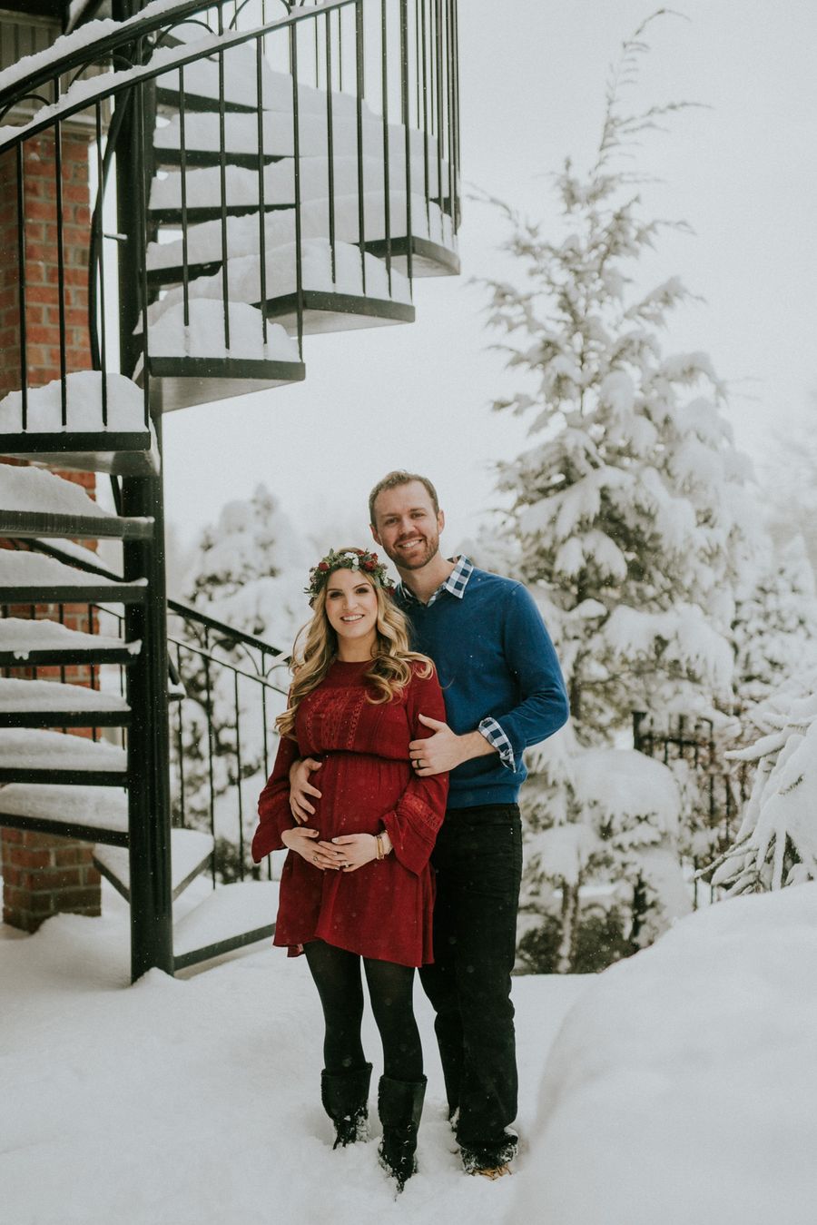 I have to say, this was one of my favourite maternity sessions ever!! It actually took place during a huge winter snowstorm. After it finally stopped snowing we snuck outside to take a few more pictures. It was -11 degrees but totally worth it for those snow-covered trees! Major props to **Michelle for braving that freezing cold weather**! She will be one tough mama, that’s for sure!