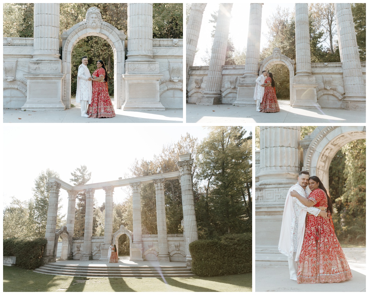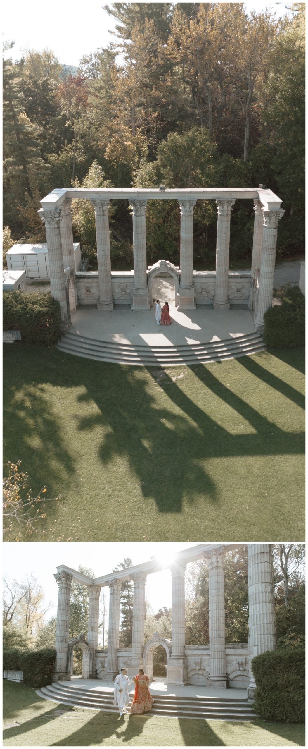 The Guild Inn Estate is filled with fascinating historic details. From the Greek Theatre and ornate stone columns to beautiful sculptures and architectural fragments from across Toronto, the venue has character in every corner. These elements make for timeless, romantic, and cinematic photos. Whether it’s dramatic portraits of the couple or fun editorial-style shots, the architecture adds depth and texture that really elevates the images.