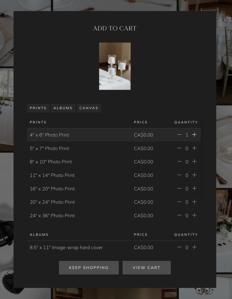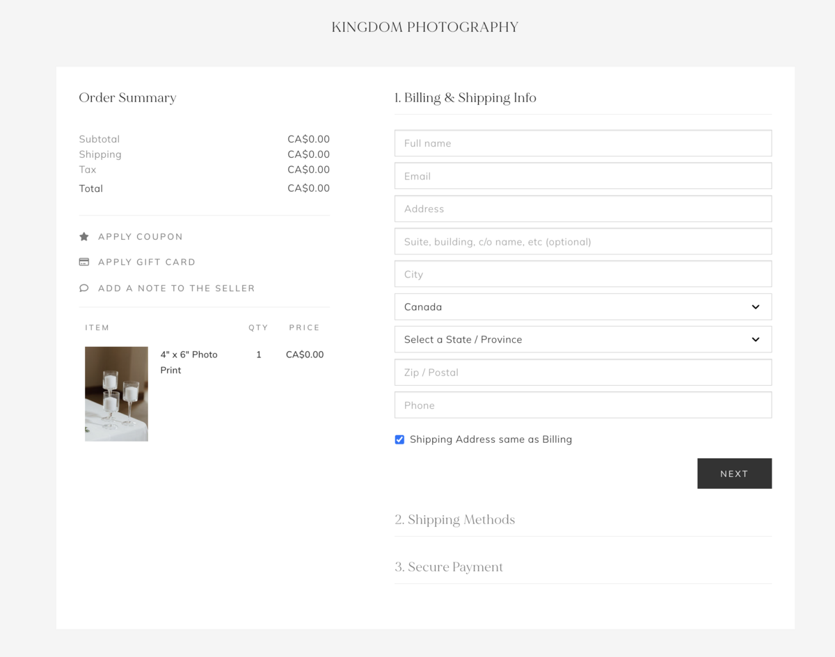 To place your order, head to your online gallery and hover over the photo you'd like to order. A shopping bag icon will appear at the bottom - click that (Step 1) and select the 4x6 photo print option (Step 2). Once you’re ready, proceed to checkout, enter your shipping details, and continue (Step 3) to the payment page (don’t worry, you won’t be charged). I’ll receive your order on my end, and your prints should arrive within 3-4 weeks.